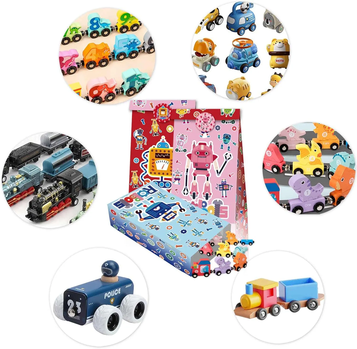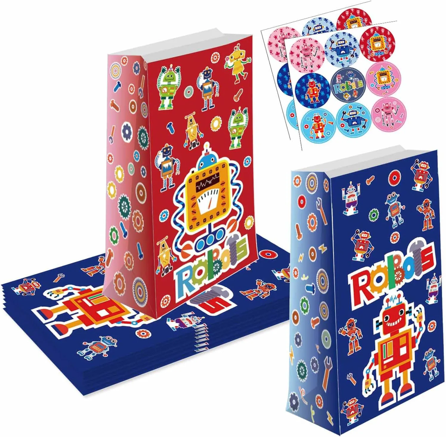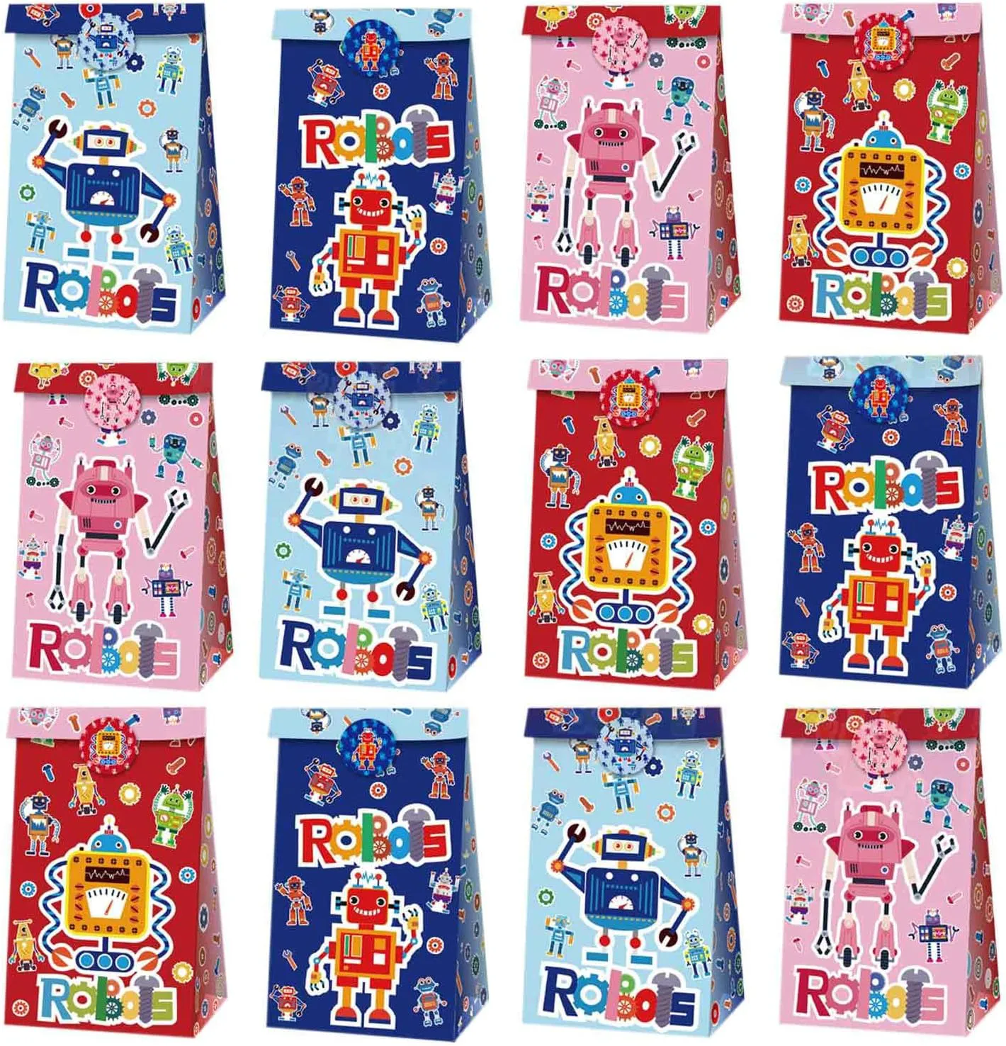 Embalaje: Obtenga divertidas bolsas de papel de regalo con estampado de robot, que incluyen 12 bolsas de papel kraft y 18 lindas pegatinas.