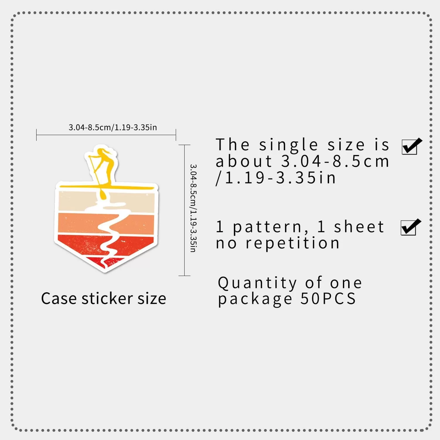 Embalaje del producto: Un total de 50 pegatinas diferentes para tablas de remo, con diseños únicos con sin patrones repetidos y tamaños moderados.
